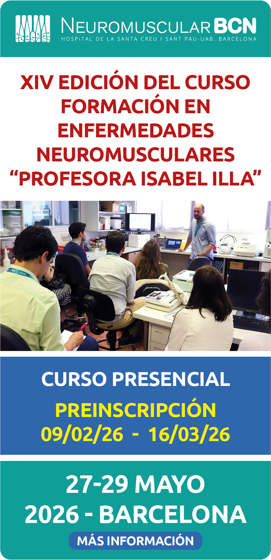 Otro año más, el Curso de Formación en Enfermedades Neuromusculares «Profesora Isabel Illa» está preparado para iniciar, brindando una oportunidad excepcional de aprendizaje de la mano de expertos de prestigio tanto a nivel nacional como internacional.